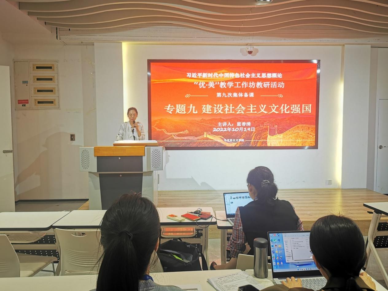 2022年10月19日,馬克思主義學(xué)院毛澤東思想和中國特色社會主義理論體系概論教研室教師開展習(xí)近平新時代中國特色社會主義思想概論課程專題九的集體備課會。集體備課會以“主備發(fā)言--集體討論--片段教學(xué)--教學(xué)反思整改”為模塊順序進(jìn)行。主備課教師藍(lán)香清老師認(rèn)真學(xué)習(xí)鉆研教學(xué)資料的基礎(chǔ)上,針對本校學(xué)生學(xué)情展開分析。對于建設(shè)社會主義文化強(qiáng)國專題在本課程中所處地位、教學(xué)目標(biāo)、教學(xué)重難點、教學(xué)過程設(shè)計等方面也說了自己的想法,并在其他老師的補充指導(dǎo)下整改完成了教案。