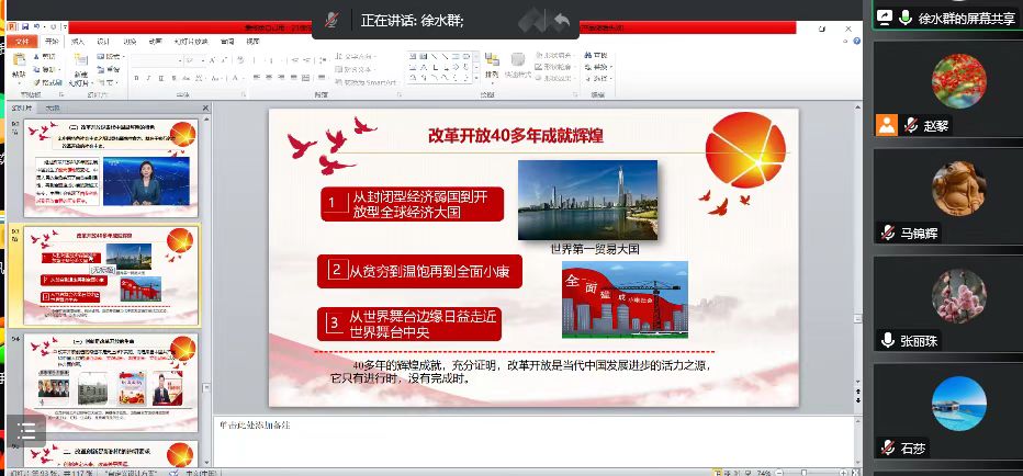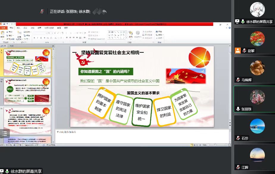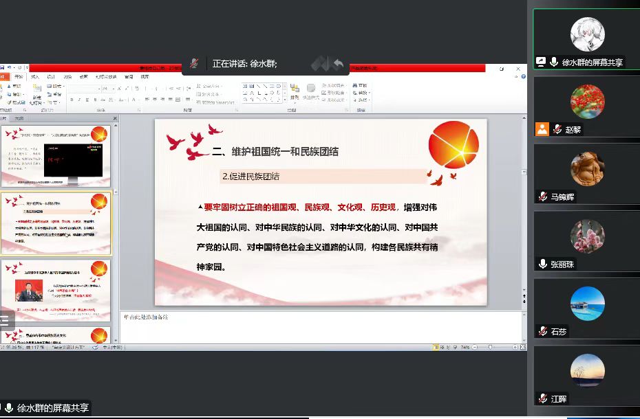 為取得更好的教學(xué)效果,徐水群老師精心準(zhǔn)備,通過上網(wǎng)查找資料、撰寫教案、制作課件,結(jié)合自己的教學(xué)經(jīng)驗、結(jié)合時事政治,對如何調(diào)動學(xué)生積極性,如何處理教材進(jìn)行了仔細(xì)推敲,取得了較好的效果。在第一節(jié)什么是中國精神、為什么要弘揚(yáng)中國精神的基礎(chǔ)上,本次集備主要講述應(yīng)該如何弘揚(yáng)中國精神。徐水群老師通過典型案例、深入剖析講解突出重點(diǎn)、突破難點(diǎn),依據(jù)大中小思政一體化的“大思政”理念,通過回顧中學(xué)內(nèi)容,更加深刻理解大學(xué)理論知識,達(dá)到事半功倍的效果。如講到民族團(tuán)結(jié)時,通過回顧我國民族分布的特點(diǎn);我國處理民族問題的根本原則;我國的民族政策等問題,更加深刻領(lǐng)會習(xí)近平總書記講的“要鑄牢中華民族共同體意識,促進(jìn)各個民族像石榴籽一樣緊緊抱在一起”。