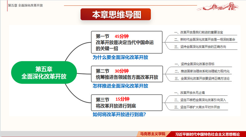 黃晉京老師主要圍繞“改革開放是決定當(dāng)代中國命運(yùn)的關(guān)鍵一招”、“統(tǒng)籌推進(jìn)各領(lǐng)域各方面改革開放”、和“將改革開放進(jìn)行到底”三個部分展開說課。尤其針對改革開放是我們前進(jìn)的重要法寶、新時代全面深化改革開放是一場深刻革命、堅持全面深化改革開放的正確方向和堅持全面深化改革總目標(biāo)等內(nèi)容進(jìn)行詳細(xì)闡釋,并結(jié)合教材和自身的教學(xué)實踐與豐富經(jīng)驗,從整體層面闡述了第五章的教學(xué)重點(diǎn)、難點(diǎn)以及對本門課程實踐教學(xué)的具體內(nèi)容及整體推進(jìn)過程提出了相關(guān)要求。
