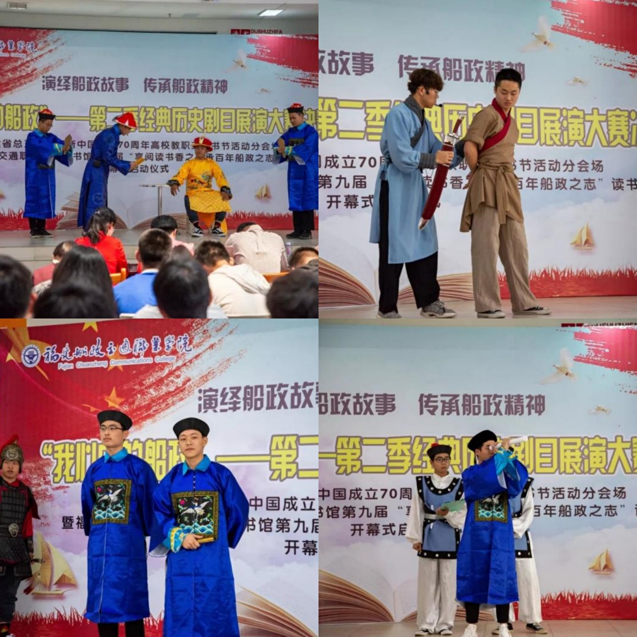 在4月23日的全天活動(dòng)中,“我和我的祖國,我與我的教學(xué)——慶祝新中國成立70周年暨高校教職工讀書節(jié)閱讀歲月演講比賽”、“福建船政交通職業(yè)學(xué)院圖書館第九屆‘享閱讀書香之美,承百年船政之志’讀書節(jié)開幕式啟動(dòng)儀式”、“紅書推薦”、“綠書簽宣傳活動(dòng)”、“油紙傘非遺技藝展示”、“福建船政交通職業(yè)學(xué)院第二季經(jīng)典歷史劇目展演大賽活動(dòng)決賽”、“最美四月天,青聽你——尋找最美船政校園朗讀者活動(dòng)”、“讀《平語近人》——校園讀書分享會(huì)”、“書法攝影展”、“福建船政交通職業(yè)學(xué)院團(tuán)委社團(tuán)分會(huì)場(chǎng)系列活動(dòng)”等10余項(xiàng)精彩紛呈的系列活動(dòng)在福建船政交通職業(yè)學(xué)院各分會(huì)場(chǎng)陸續(xù)開展。通過創(chuàng)新活動(dòng)形式與載體、豐富活動(dòng)內(nèi)涵和內(nèi)容,踐行社會(huì)主義核心價(jià)值觀,弘揚(yáng)和創(chuàng)新中華優(yōu)秀傳統(tǒng)文化。全力打造以學(xué)生群體為主體,以文化傳承和素質(zhì)提升為宗旨,以船政交通文化為紐帶的“文明校園,書香船政”文化平臺(tái)。