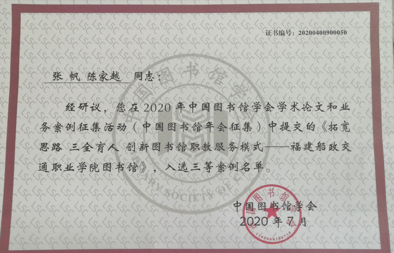 2020年,中國圖書館學(xué)會主辦了以“滋養(yǎng)民族心靈 培育文化自信”為主題的中國圖書館學(xué)會學(xué)術(shù)論文和業(yè)務(wù)案例征集活動,共設(shè)38個分主題,分為“中國圖書館年會征集”和“專題交流活動征集”兩個大類組織實施。本次征集活動共計征集稿件1200余篇,經(jīng)各專家組和研議會綜合評定,我館選送的業(yè)務(wù)案例《拓寬思路 三全育人創(chuàng)新圖書館職教服務(wù)模式》入選三等案例。