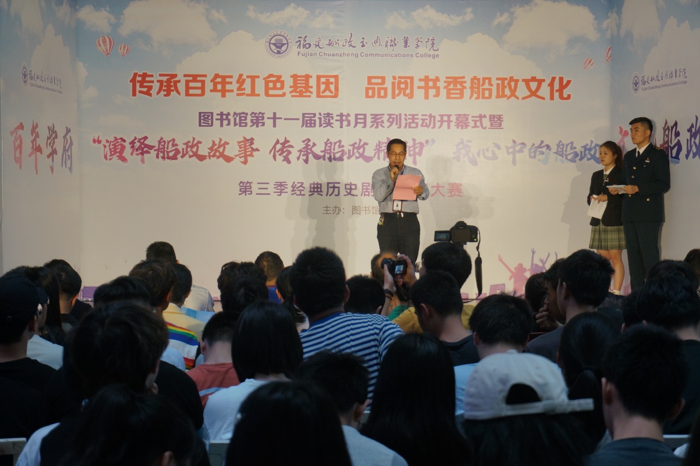 開幕式上,張祖柱副院長為此次活動致辭,鼓勵廣大師生多讀書、讀好書,充分肯定了本次活動的重要意義,并為圖書館學(xué)生館員聯(lián)合會青年志愿者“愛心大使”頒獎。同時,還舉行了“我心中的船政-----第三季經(jīng)典歷史劇目展演”大賽決賽活動,通過形式多樣的藝術(shù)表現(xiàn)形式,把船政文化生動地呈現(xiàn)給現(xiàn)場的評委老師以及觀眾。最終,來自安環(huán)學(xué)院的《甲午海戰(zhàn)中英勇赴海的鄧世昌》話劇作品,獲得此次比賽的一等獎。