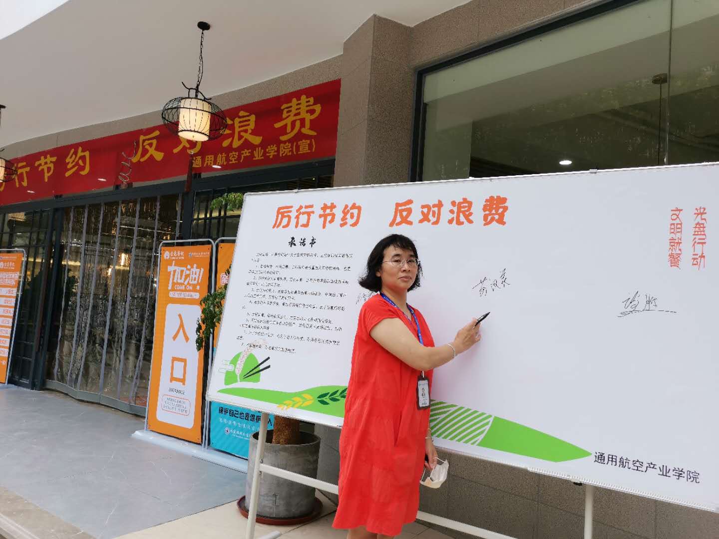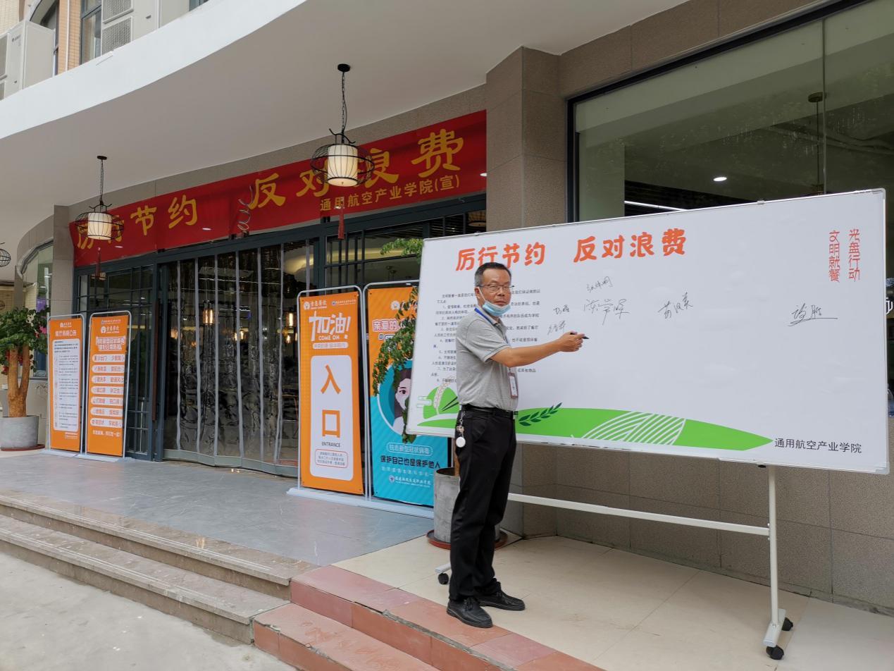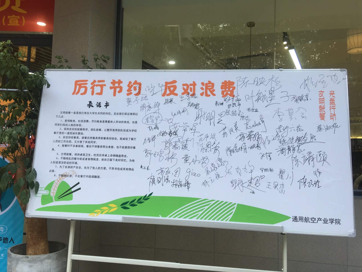 勤儉節(jié)約是中華民族的優(yōu)良品德,為了將文明健康、綠色環(huán)保的理念融入日常生活。通用航空產(chǎn)業(yè)學院在2018級、2019級學生返校之際,開展以“厲行節(jié)約,反對浪費”為主題的系列活動,通用航空產(chǎn)業(yè)學院院長陳常暉、黨總支副書記蘇漢美、副院長王顯彬等領(lǐng)導,及學院師生,食堂員工等也紛紛在“厲行節(jié)約,反對浪費”簽名墻上簽署名字,帶頭承諾,發(fā)揮帶頭表率作用。隨后,院領(lǐng)導深入學生食堂與學生一同用餐,用光盤行動,詮釋浪費可恥、節(jié)約為榮。