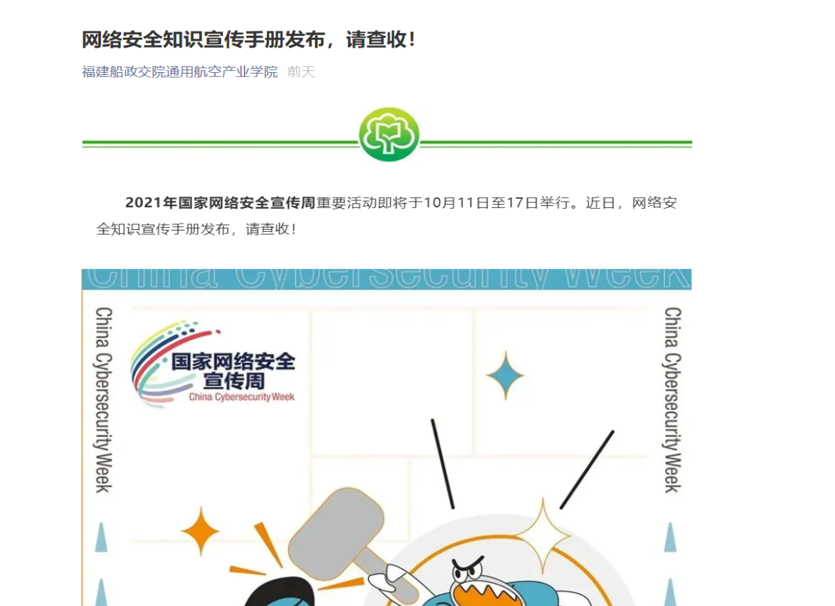 在2021年國(guó)家網(wǎng)絡(luò)安全宣傳周期間,通航空產(chǎn)業(yè)學(xué)院開展了一系列線上線下活動(dòng),引導(dǎo)師生養(yǎng)成依法上網(wǎng)、文明上網(wǎng)、安全上網(wǎng)的良好習(xí)慣。二是轉(zhuǎn)載官方網(wǎng)站宣傳網(wǎng)絡(luò)安全小視頻,提醒師生保護(hù)個(gè)人信息,謹(jǐn)防被騙;三是全方位動(dòng)員師生自覺成為維護(hù)國(guó)家網(wǎng)絡(luò)安全的重要力量,爭(zhēng)做網(wǎng)絡(luò)安全的踐行者、參與者、推動(dòng)者、宣傳者,為共享共建清朗、便捷的網(wǎng)絡(luò)空間,共同維護(hù)國(guó)家網(wǎng)絡(luò)安全營(yíng)造良好的氛圍。