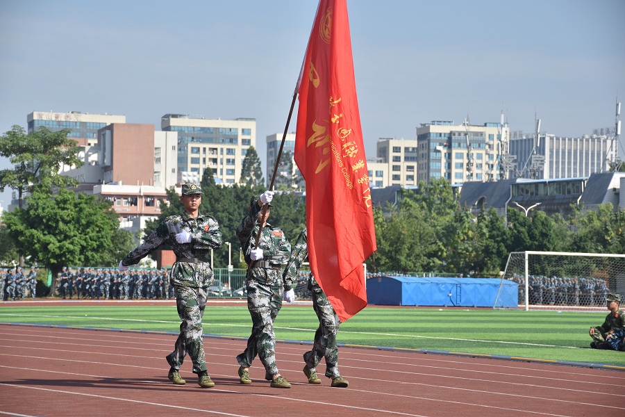 2017級學(xué)生身著軍訓(xùn)服裝,在軍訓(xùn)旗的引領(lǐng)下,踏著分列式進行曲的鼓點,步伐整齊、精神高昂、口號響亮地走向主席臺接受領(lǐng)導(dǎo)來賓的檢閱。緊接著,擒敵拳方陣、格斗術(shù)方陣、單個軍人隊列動作方陣給大家呈現(xiàn)了氣勢如虹的精彩表演,他們動作規(guī)范、英勇果敢,贏得了全場的陣陣掌聲。