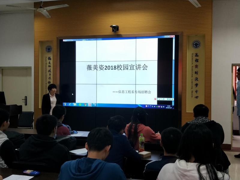 信息工程系于2018年11月2日中午12:30至下午3:00在北區(qū)2號樓2-1教室舉辦了信息工程系畢業(yè)生招聘宣講會,薇美姿(舒克)實業(yè)有限公司宣講人--林小姐為同學(xué)做了簡單的介紹,薇美姿是集研發(fā)、生產(chǎn)和銷售于一體的創(chuàng)新性高科技企業(yè)。旗下?lián)碛袃纱罂谇蛔o理品牌舒客和舒客寶貝。產(chǎn)品遍布全國各省市,并已全線進入沃爾瑪、家樂福、歐尚、易初蓮花、吉之島、大潤發(fā)等國際、國內(nèi)大型連鎖賣場,實現(xiàn)了KA賣場、大型百貨店、日化專賣店、藥業(yè)連鎖店及電子商務(wù)的全方位覆蓋。
