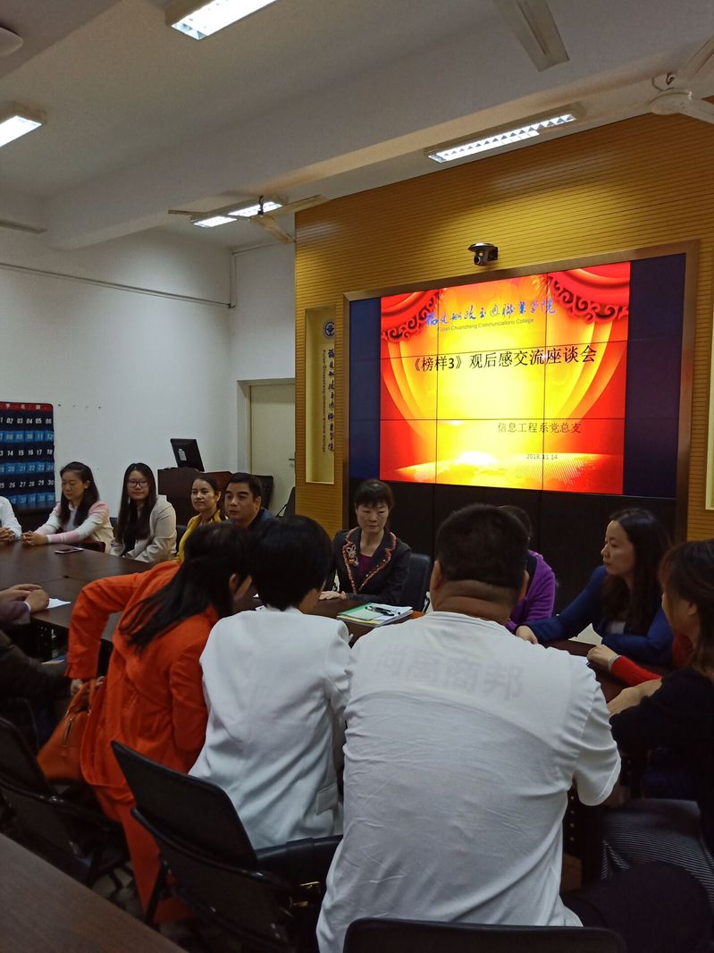 根據(jù)《中共中央組織部辦公廳關(guān)于認(rèn)真做好<榜樣3>專題節(jié)目學(xué)習(xí)宣傳工作的通知》(組廳字[2018]42號)文件精神,以及福建船政交通職業(yè)學(xué)院黨委工作部的統(tǒng)一部署,信息工程系黨總支把組織學(xué)習(xí)專題節(jié)目《榜樣3》作為開展“兩學(xué)一做”學(xué)習(xí)教育的一項(xiàng)重要內(nèi)容,于2018年11月14日集中全系黨員教職工在2-1遠(yuǎn)程教室集中觀看《榜樣3》,觀影結(jié)束后,開展熱烈的座談交流,每位黨員依次發(fā)表了相關(guān)體會,全體黨員圍繞“不忘初心、繼續(xù)前行”,結(jié)合各自工作實(shí)際,從看榜樣、學(xué)榜樣,以感動變帶動、化感動為行動的方面進(jìn)行了深入交流探討。