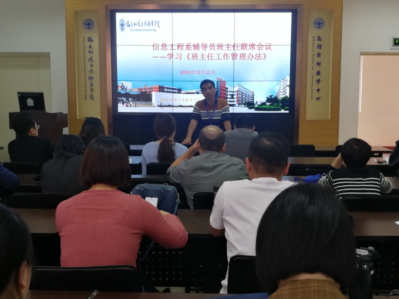 我系按照學(xué)院要求,于2019年11月11日中午12點(diǎn)30分,組織全體班主任在2號(hào)樓201室進(jìn)行學(xué)習(xí)。會(huì)議由信息工工程系黨總支孫基書(shū)記主持,在會(huì)上孫基書(shū)記帶領(lǐng)全體班主任認(rèn)真學(xué)習(xí)研讀了《福建船政交通職業(yè)學(xué)院班主任管理辦法》,他指出班主任是學(xué)校思想政治教育、學(xué)生管理工作的重要組成部分,是開(kāi)展大學(xué)生思想政治教育的骨干力量,是學(xué)生健康成長(zhǎng)成才的引路人,強(qiáng)調(diào)所有班主任要協(xié)同輔導(dǎo)員一起做好思想引領(lǐng)、學(xué)業(yè)指導(dǎo)、大學(xué)生涯輔導(dǎo)和職業(yè)規(guī)劃等工作。他強(qiáng)調(diào)做好班主任工作的關(guān)鍵在于要有教書(shū)育人的情懷、要有對(duì)學(xué)生的熱愛(ài)。會(huì)上,孫基書(shū)記還對(duì)班主任的近期工作重點(diǎn)提出要求: