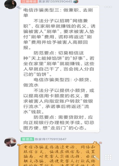 薛凌志,19計算機網(wǎng)絡技術1班學生,入讀大學之前做過輔警,接觸過網(wǎng)絡詐騙的案件,參加過網(wǎng)絡詐騙培訓,對網(wǎng)絡詐騙有一定了解。為此,信息系決定開展一次線上防詐騙主題宣傳,由薛凌志擔任宣講人。全部以學生為主的線上防詐騙宣傳是一個全新嘗試,在輔導員和班主任的指導下,由薛凌志同學制定宣講計劃,構建15種詐騙類型框架,同時輔以案例強化理解。為期三個晚上的宣講既注重重點講解,又注重過程互動,學生反響強烈。根據(jù)反饋,各班級QQ群上線率、參與率平均達90%,宣傳效果良好。