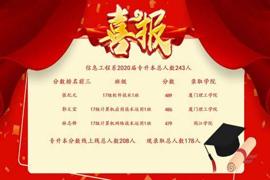 其中17級(jí)軟件技術(shù)1班張紀(jì)元同學(xué),專(zhuān)升本分?jǐn)?shù)489分被廈門(mén)理工學(xué)院錄取;17級(jí)計(jì)算機(jī)技術(shù)運(yùn)用1班郭文宏同學(xué),專(zhuān)升本分?jǐn)?shù)486分被廈門(mén)理工學(xué)院錄取;17級(jí)計(jì)算機(jī)網(wǎng)絡(luò)技術(shù)運(yùn)用1班林志鋒同學(xué),專(zhuān)升本分?jǐn)?shù)479分被閩江學(xué)院錄取。捷報(bào)傳來(lái),我院師生歡欣鼓舞!