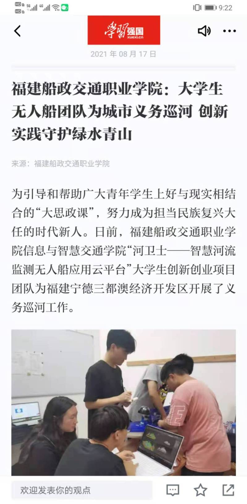 為引導(dǎo)和幫助廣大青年學(xué)生上好與現(xiàn)實(shí)相結(jié)合的“大思政課”,努力成為擔(dān)當(dāng)民族復(fù)興大任的時(shí)代新人。日前,福建船政交通職業(yè)學(xué)院信息與智慧交通學(xué)院“河衛(wèi)士——智慧河流監(jiān)測(cè)無(wú)人船應(yīng)用云平臺(tái)”大學(xué)生創(chuàng)新創(chuàng)業(yè)項(xiàng)目團(tuán)隊(duì)為福建寧德三都澳經(jīng)濟(jì)開(kāi)發(fā)區(qū)開(kāi)展了義務(wù)巡河工作。