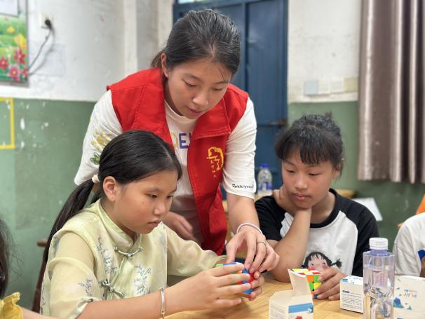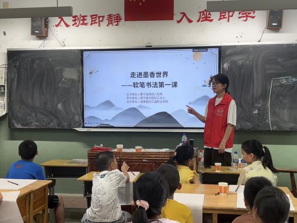 在泰寧的夏日課堂,支教的青春身影熠熠生輝。促進(jìn)團(tuán)俯身教孩子們玩轉(zhuǎn)魔方,指尖轉(zhuǎn)動(dòng)間,是思維啟迪的奇妙旅程;站上講臺(tái)講“軟筆書法第一課”,筆觸游走時(shí),讓墨香沁入童真。這一趟支教行,以知識(shí)為舟,載著熱忱與希望,在孩子們心湖泛起波光,也讓青春在鄉(xiāng)野支教中,書寫照亮成長的溫暖注腳 。