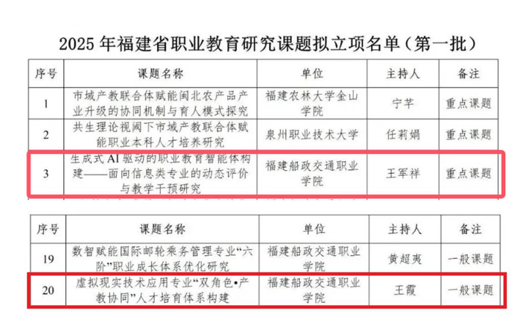 根據(jù)《關(guān)于開展2025年福建省職業(yè)教育研究課題立項申報工作的通知》(閩職教中〔2025〕8號),經(jīng)福建省職業(yè)技術(shù)教育中心組織專家評審、會議研究,王軍祥老師申報的《生成式AI驅(qū)動的職業(yè)教育智能體構(gòu)建-面向信息類專業(yè)的動態(tài)評價與教學(xué)干預(yù)研究》獲批重點(diǎn)課題立項;我院王霞老師申報的《虛擬現(xiàn)實(shí)技術(shù)應(yīng)用專業(yè)“雙角色?產(chǎn)教協(xié)同”人才培育體系構(gòu)建》獲批一般課題立項。
