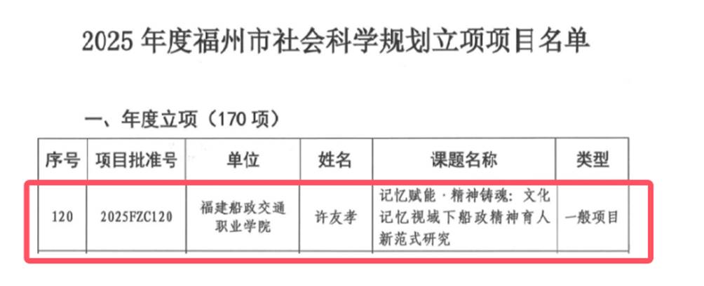 根據(jù)《福州市社會科學(xué)規(guī)劃項目管理辦法》,經(jīng)專家組評審,市社科規(guī)劃領(lǐng)導(dǎo)小組審議通過,2025年度福州市社會科學(xué)規(guī)劃共立項281個項目,其中我院許友孝老師申報的《記憶賦能·精神鑄魂:文化記憶視域下船政精神育人新范式研究》獲批立項。