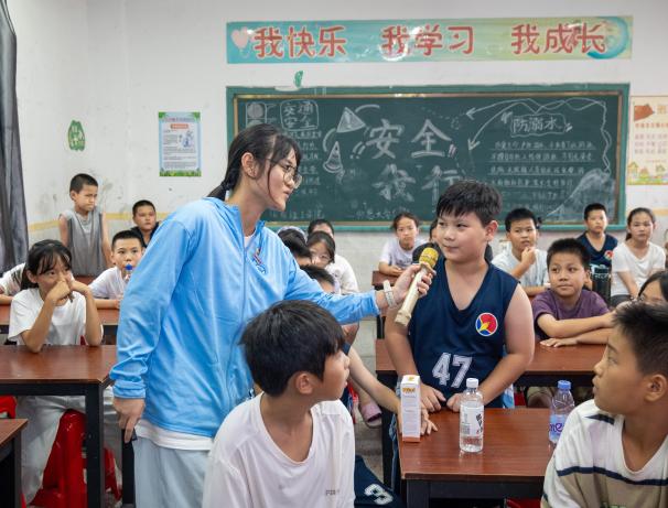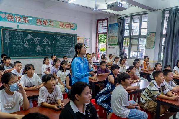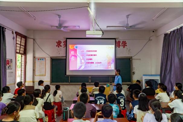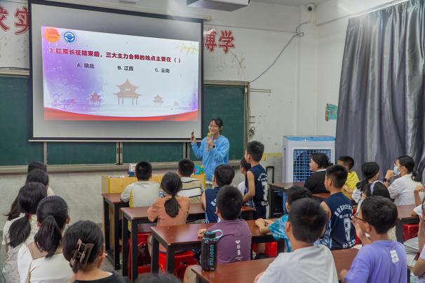 在從博物館汲取紅色力量后,實(shí)踐團(tuán)成員又將這份紅色精神帶到了校園,為孩子們開啟了一場(chǎng)紅色之旅。在錦豐小學(xué),實(shí)踐團(tuán)成員開展的愛國(guó)主義教育講座以 “紅色長(zhǎng)征” 為主線,實(shí)踐團(tuán)成員用通俗易懂的語(yǔ)言,結(jié)合歷史圖片和小故事,講述了紅軍長(zhǎng)征中強(qiáng)渡大渡河、飛奪瀘定橋等戰(zhàn)役里的艱難與英雄事跡,孩子們聽得十分專注,稚嫩的臉龐上不時(shí)露出動(dòng)容的神情,被紅軍精神深深打動(dòng)。