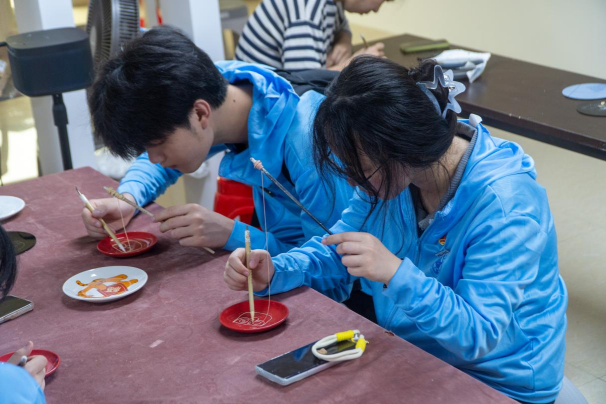 三下鄉(xiāng)隊(duì)伍駐足漆線雕傳承工作室,推開工作室的門,便置身于大漆與歲月交織的藝術(shù)空間。漆線雕作為閩南傳統(tǒng)工藝,將天然大漆與陳年磚粉經(jīng)反復(fù)舂搗調(diào)和,制成柔韌的 “漆線土”。匠人憑借嫻熟技法,在素白瓷坯上盤繞出纏枝蓮紋、祥云朵朵等立體紋樣,再施以金箔、彩料裝飾,最終呈現(xiàn)出精美的漆線雕作品。其色彩與紋樣承載著閩南地區(qū)的民俗信仰與生活風(fēng)情,是地域文化的生動寫照。成員們親手嘗試盤制簡單圖案,通過指尖觸感,切實(shí)體會到這門千年技藝的深厚底蘊(yùn)與獨(dú)特魅力。