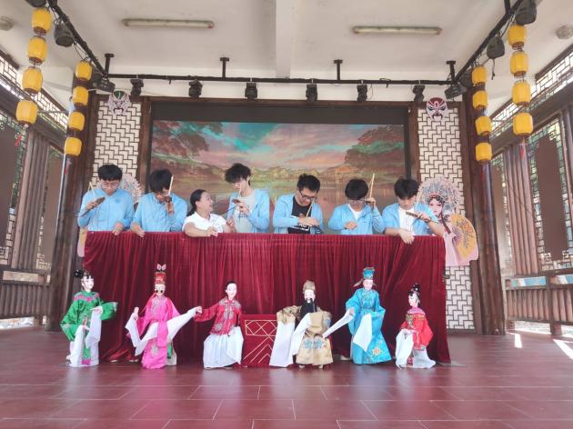 暮色之中,傳承團(tuán)前往木偶戲戲臺學(xué)習(xí)提線木偶。在觀看了一場精彩的《拜壽》戲曲后,成員們躍躍欲試,開始對提線木偶技藝進(jìn)行初步嘗試。細(xì)繩纏繞指尖,輕拉慢放間,木偶仿佛被注入了生命,輕輕顫動。成員們?nèi)褙炞?,一絲不茍地模仿師傅的動作,盡管手法尚顯生疏,卻難掩對這門古老藝術(shù)的敬畏與熱愛。在這靜謐與靈動交織的瞬間,傳統(tǒng)技藝的種子悄然播撒心田,激發(fā)起成員們傳承與創(chuàng)新的責(zé)任感。