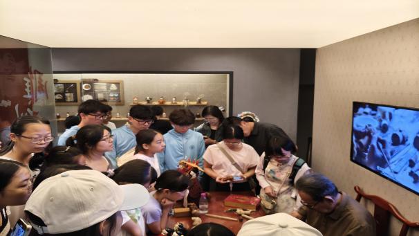 成員們圍攏在木偶工作臺(tái)旁,老匠人的刻刀起落間,木屑紛飛,他們從中感知木偶頭“三分面七分神”的奧秘。展柜里,閩南民居模型的榫卯結(jié)構(gòu)吸引著傳承團(tuán)成員,他們反復(fù)端詳。聆聽(tīng)非遺故事,觸摸技藝溫度,傳承團(tuán)心中滿是對(duì)閩藝的震撼與傳承熱忱。