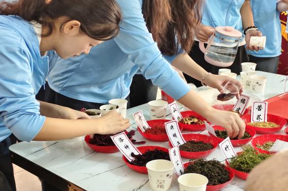 社區(qū)活動(dòng)室內(nèi),陣陣花草香悄然彌漫。實(shí)踐團(tuán)成員們提前備好枸杞、洛神花、玫瑰、決明子等應(yīng)季花草食材,細(xì)心清洗、分類分裝。當(dāng)老人們陸續(xù)入座,年輕的身影在茶桌間穿梭忙碌:溫水潤杯、投茶注水,動(dòng)作雖略顯生澀,卻透著十足的認(rèn)真。