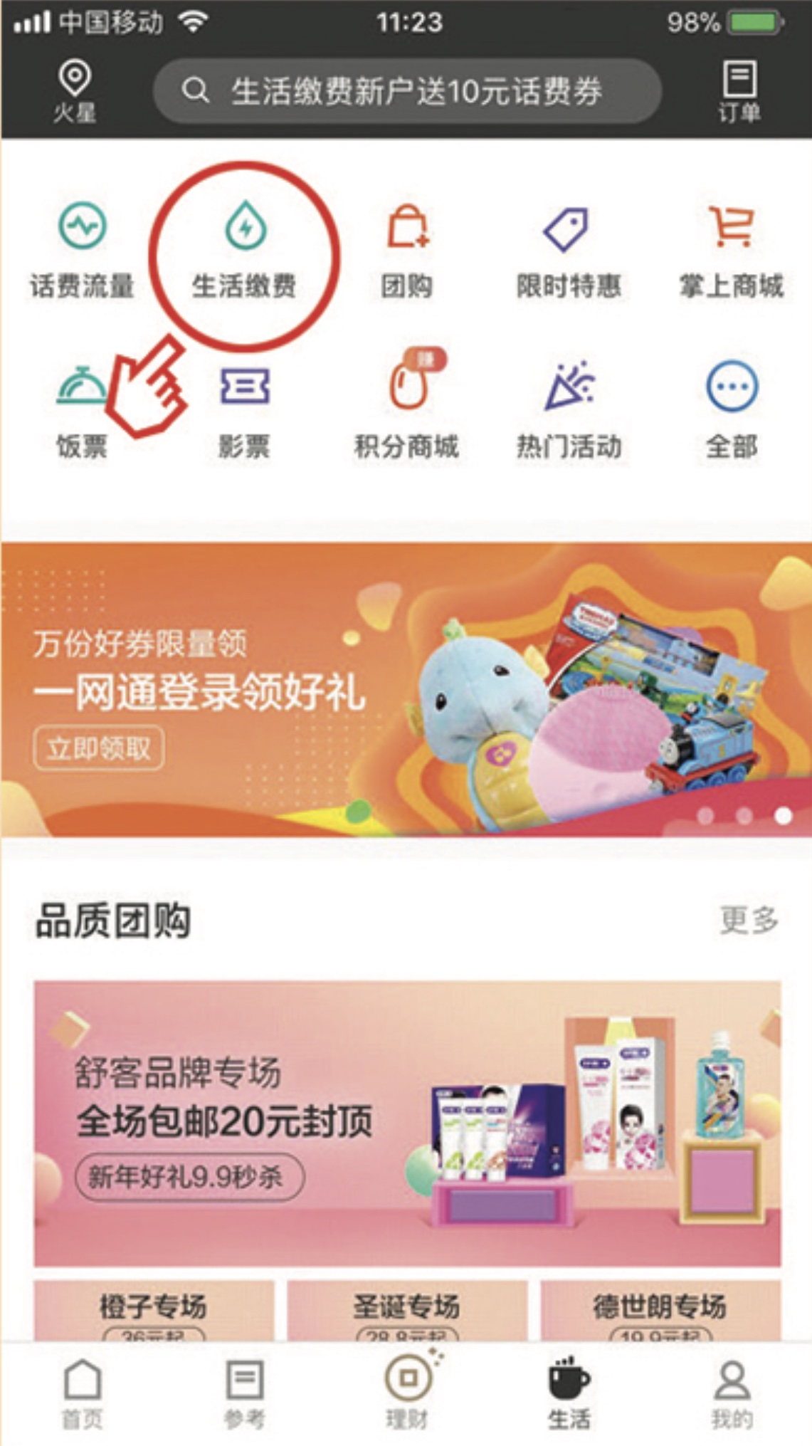 返回首頁后點擊下方“生活”頻道中“生活繳費”按鈕